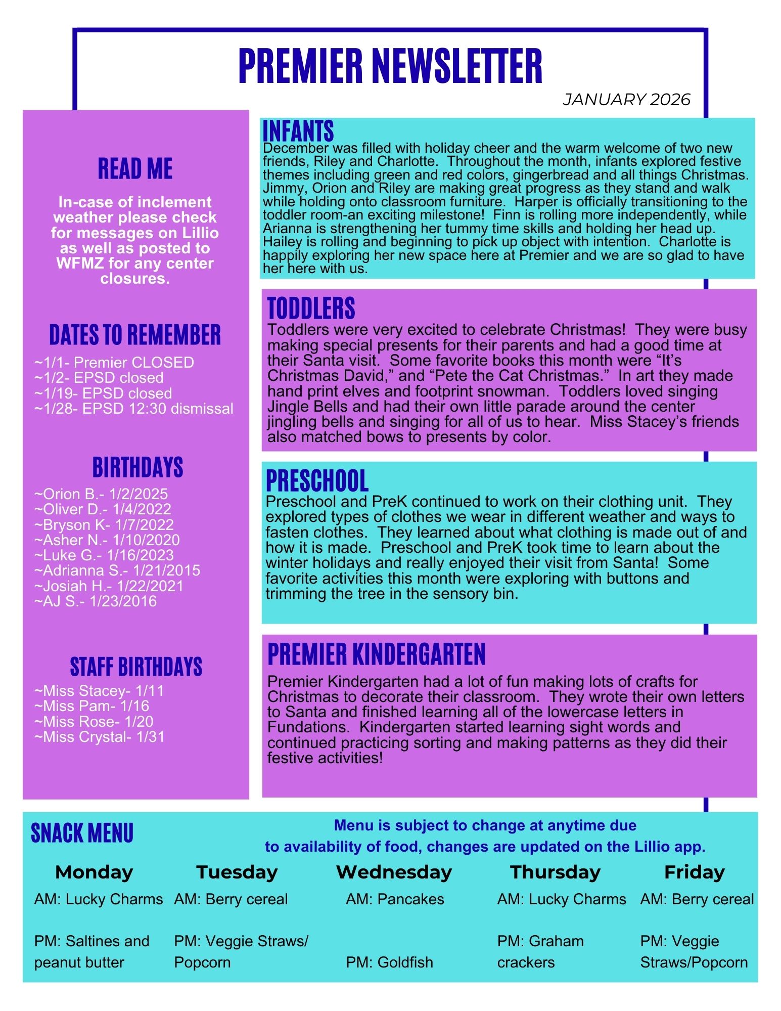 Premier Early Learning Center's Monthly Newsletter and Snack Menu